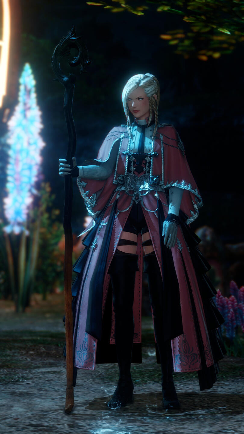 infos:• she's now 127 years old (time bubble) from her time as the oracle on the first• her body, hair and eyes turning white are due to the long-term exposure to the light• whilst now lacking pupils, her vision remains the same, but it does give her the ability to percieve sin eaters despite being on the source, where they would normally not exist at all• as she gets acquainted with her visions of sin eaters, she realizes she can interact with them and later attune to them to control them• she has now a custom combat class titled 'priestess of light', a magical dps-oriented class that utilizes a staff, harnessing the ability to control sin eaters. the priestess of light can summon sin eaters to aid in battle.